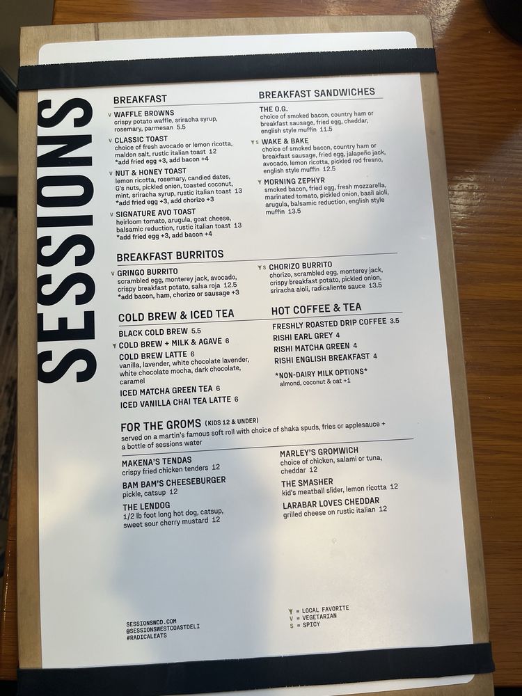 Located in the heart of Irvine, CA, Sessions West Coast Deli offers a vibrant menu that fuses traditional deli favorites with a modern twist. This trendy eatery provides diverse options for breakfast, lunch, and dinner, including the celebrated Morning Zephyr breakfast sandwich and exquisite Signature Sandwiches like the Goodmother. Guests rave about their crispy Rosemary Skinny Fries served with a house-made adobo buttermilk sauce, as well as the delightful Tomato Soup, a comforting option enhanced with basil pesto and croutons.